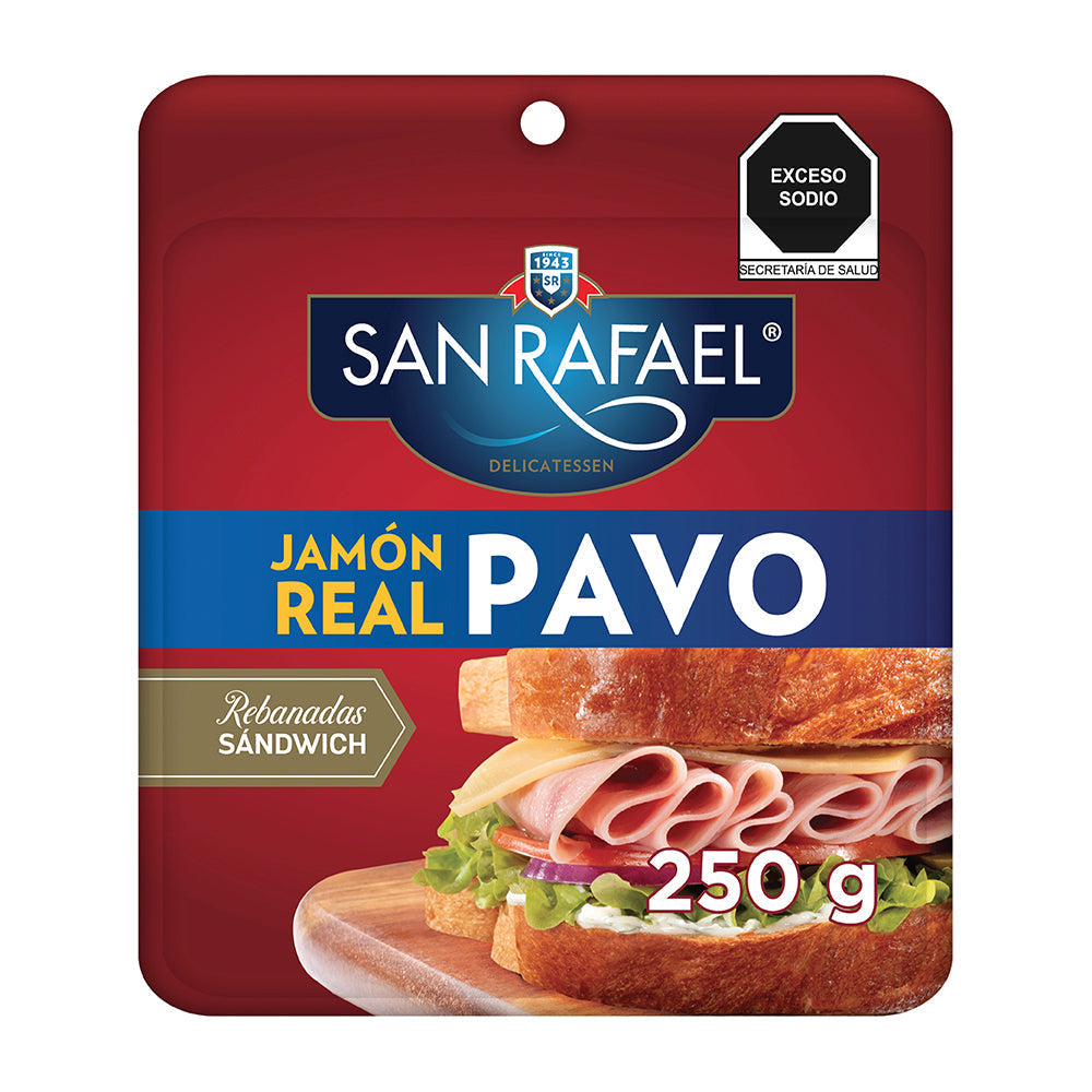 Jamón de pavo con la calidad de San Rafael con el tamaño justo del pan para realizar sándwich con un empaque rígido-rígido, ideal para la conservación y frescura del producto.